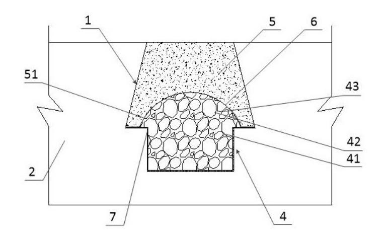 1、制作沟槽(见下图),将沟槽沿地下室底板的渗漏点设置在地下室底板上,并且,沟槽延伸至集水井或管沟处;2、沟槽的底部设有呈蘑菇状的疏导部,其填充有第一填充物;